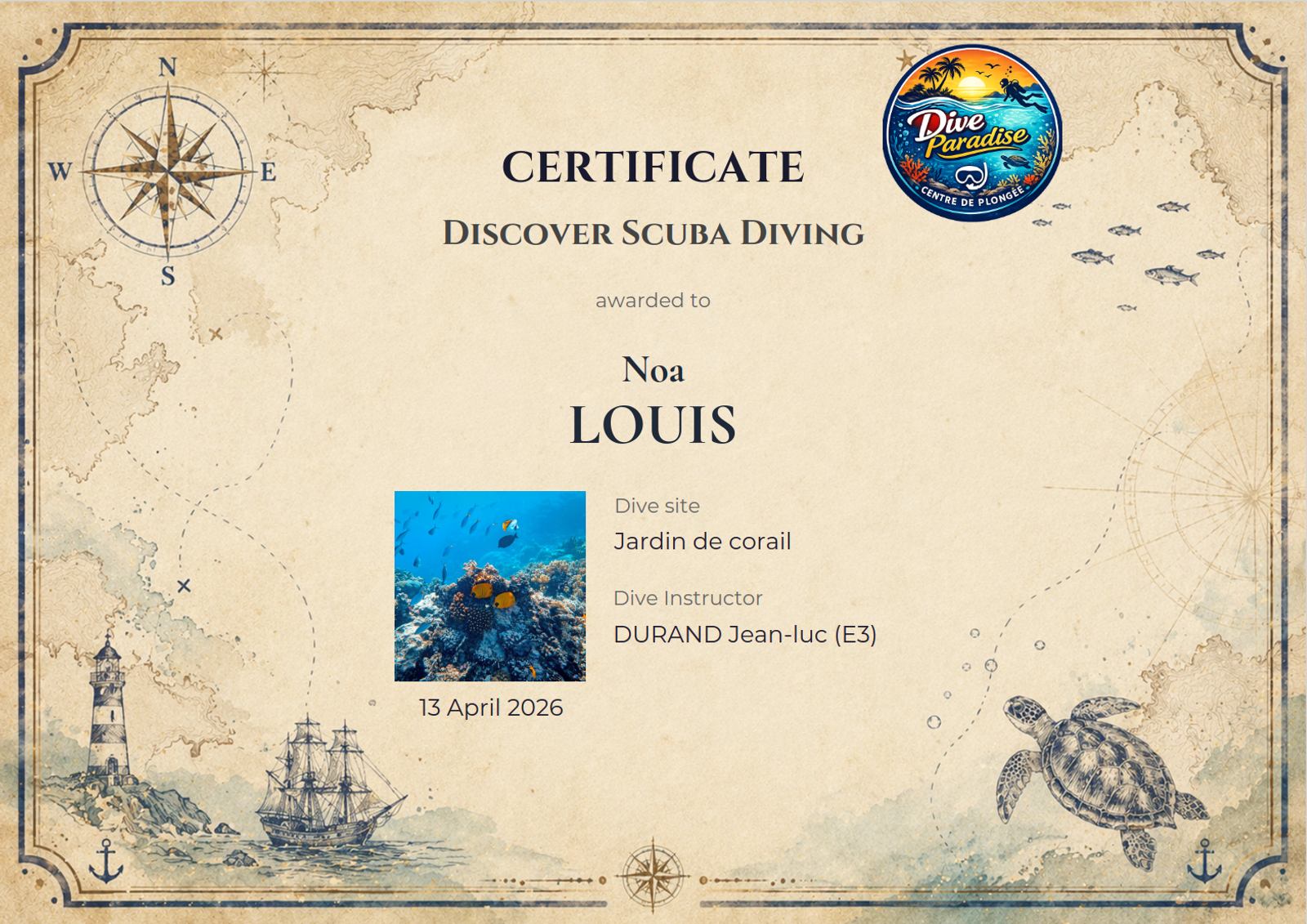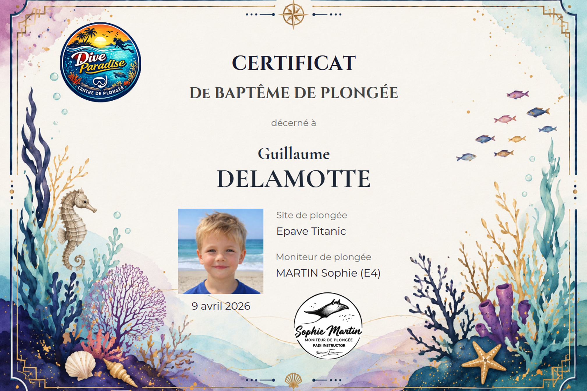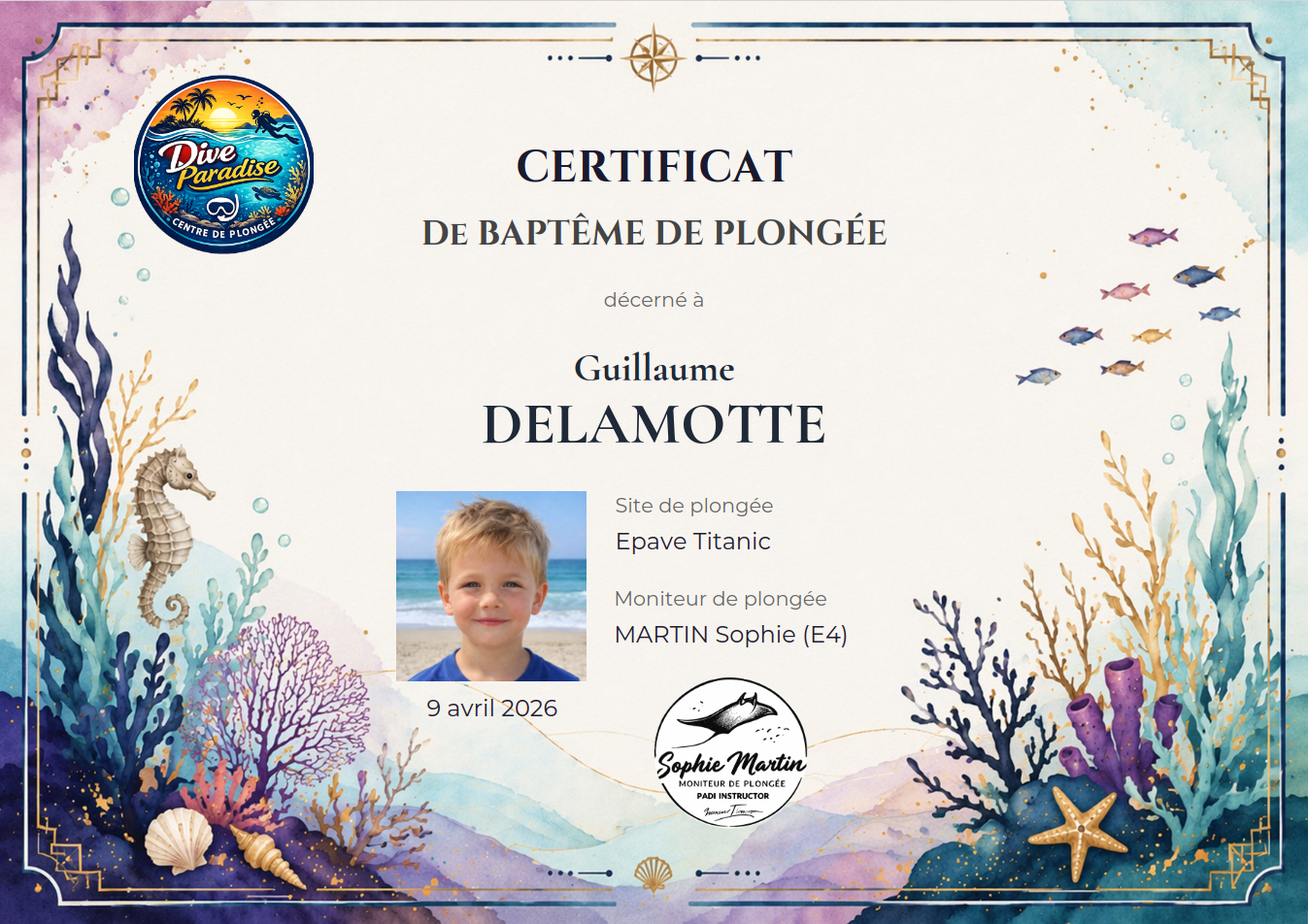 Un baptême de plongée est souvent un moment magique. Pour beaucoup de vos clients, c'est une première expérience sous-marine qu'ils garderont en mémoire toute leur vie. Et si vous pouviez prolonger cette émotion avec un certificat personnalisé, envoyé directement par email ?