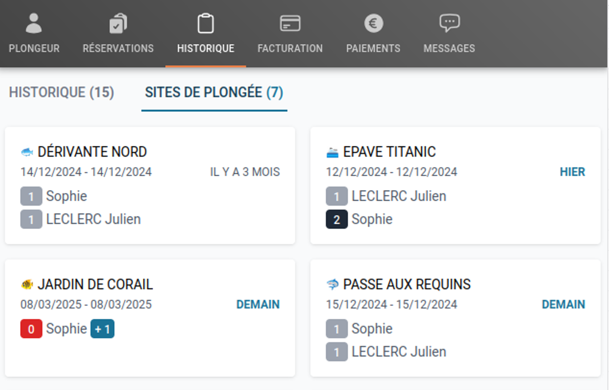 Historique des plongées clients pour leur proposer des sites variés !