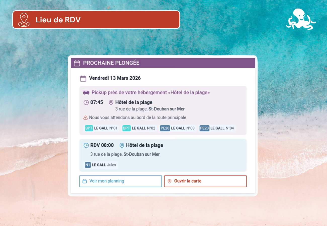 Plus besoin de réécrire les instructions à chaque réservation. Lorsque vous créez une sortie sur votre planning, vous sélectionnez le lieu en un clic. L'information est automatiquement transmise au client. Et pour ne rien rater, le client reçoit un rappel du lieu de RDV avant la plongée !